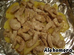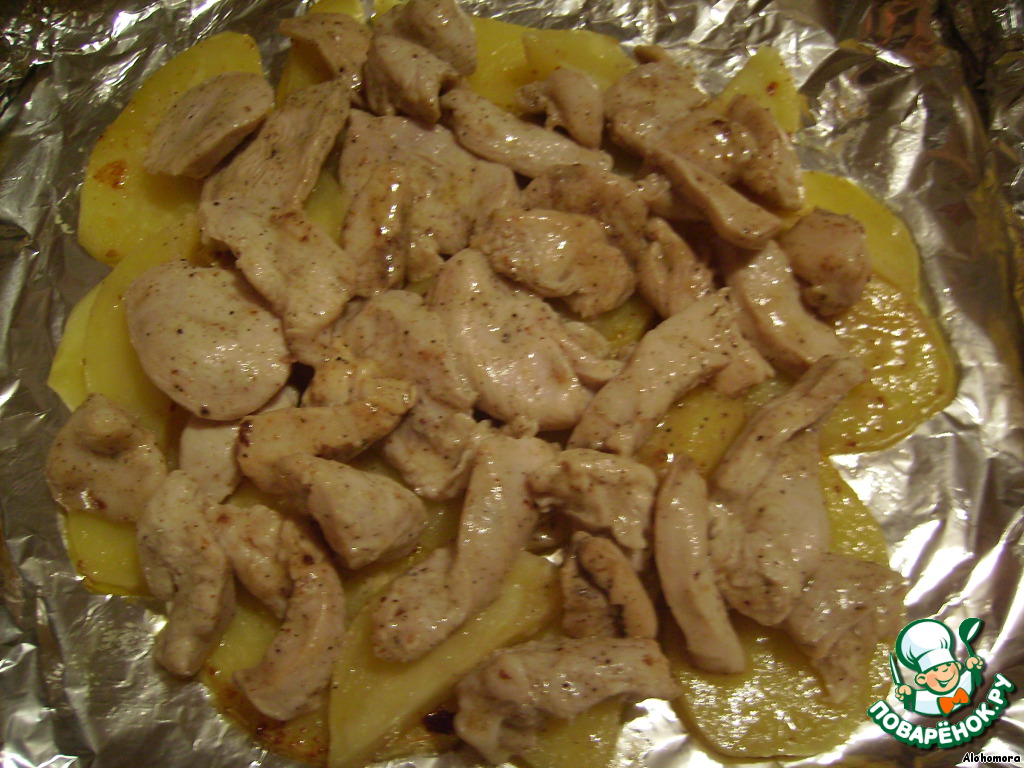 • на противень стелем фольгу, делаем бортики и выкладываем картофель, а сверху курицу)