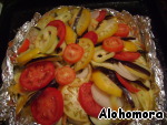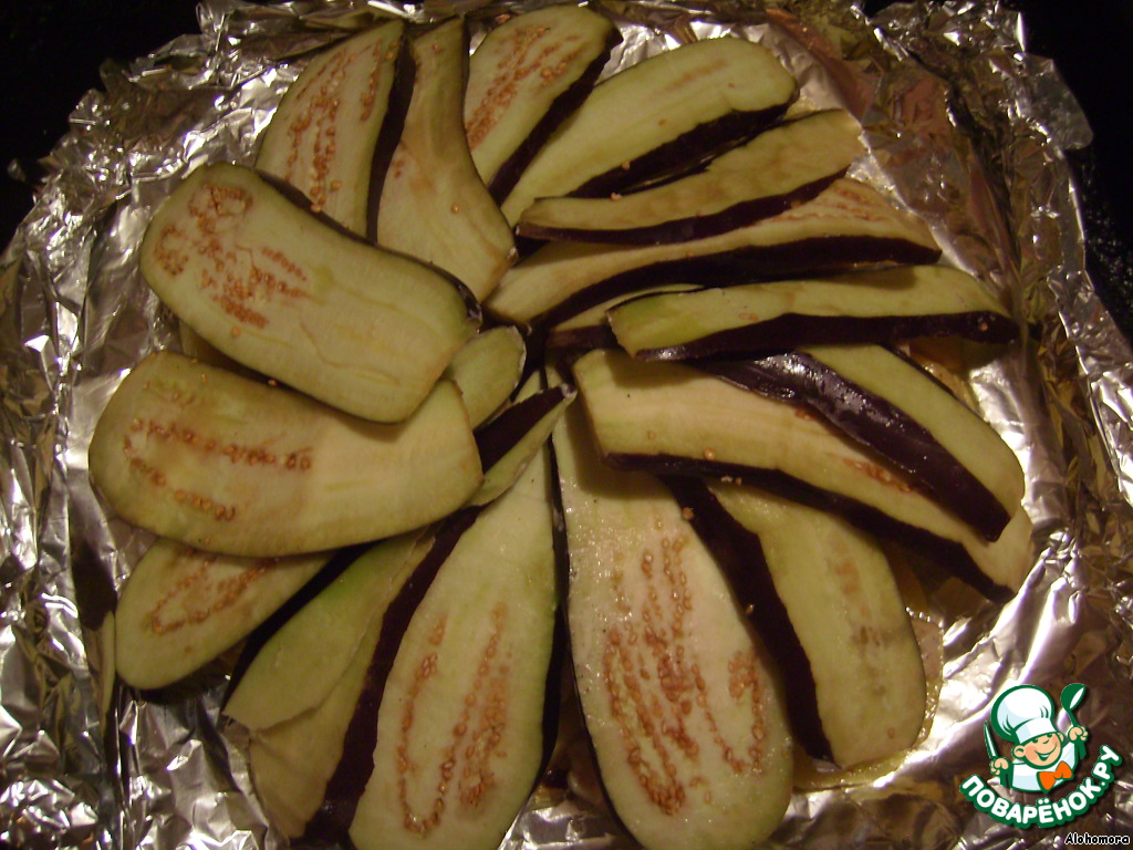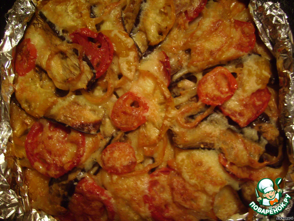 • лук, перец и помидоры режем кольцами и кладем между пластинами баклажана)