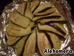• баклажаны режем вдоль полосками и выкладываем внахлест на картофель с курицей)