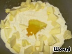 • Масло сливочное нарезать кубиками, муку просеять, выложить в глубокую тарелку, добавить холодную воду, щепотку соли, яйцо.