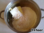 Смешать размягченное сливочное масло, соду, чайную ложку соли и муку