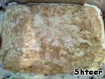 Смешать мучную смесь с яйцами. Должно получиться нежное песочное тесто, если оно получается жидковатым (это зависит от размера яиц), добавьте ещё немного муки. Полученное тесто разделить на две части, раскатать в тонкие коржи (размеры моего противня 25х35 см), достаточно часто проткнуть вилкой.