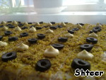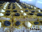 Маслины нарезать на тоненькие колечки и украсить ими наши тортики.