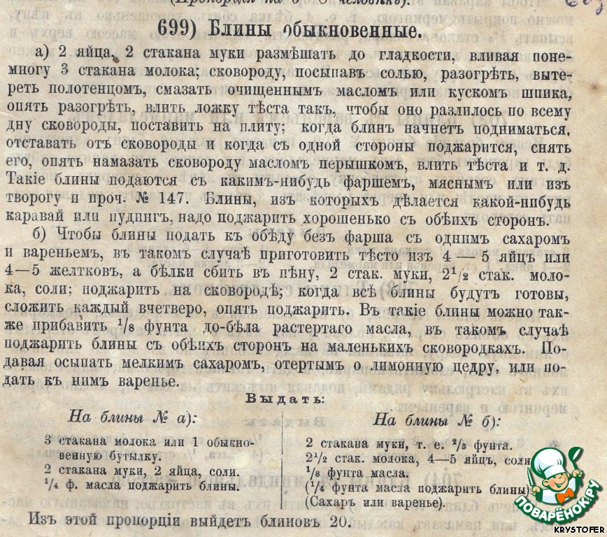 А) 2 яйца, 2 стакана муки размешать до гладкости, вливая понемногу 3 стакана молока; сковороду, посыпав солью, разогреть, вытереть полотенцом, смазать очищенным маслом или куском шпика, опять разогреть, влить ложку теста так, чтобы оно разлилось по всему дну сковороды, поставить на плиту; когда блин начнeт подниматься, отставать от сковороды и когда с одной стороны поджарится, снять его, опять намазать сковороду маслом перышком, влить теста и т. д.