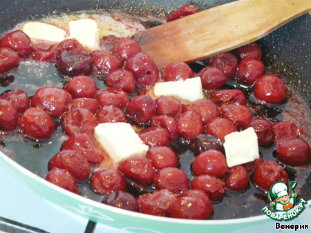 Добавить в соус вишню и, непрерывно мешая, добавить по одному кусочки сливочного масла. Посолить, поперчить. -