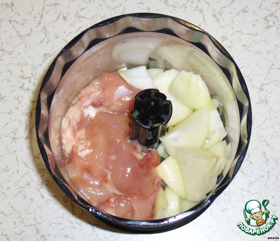 Мясо отделила от костей и перемолола с заранее нарезанным репчатым луком.
