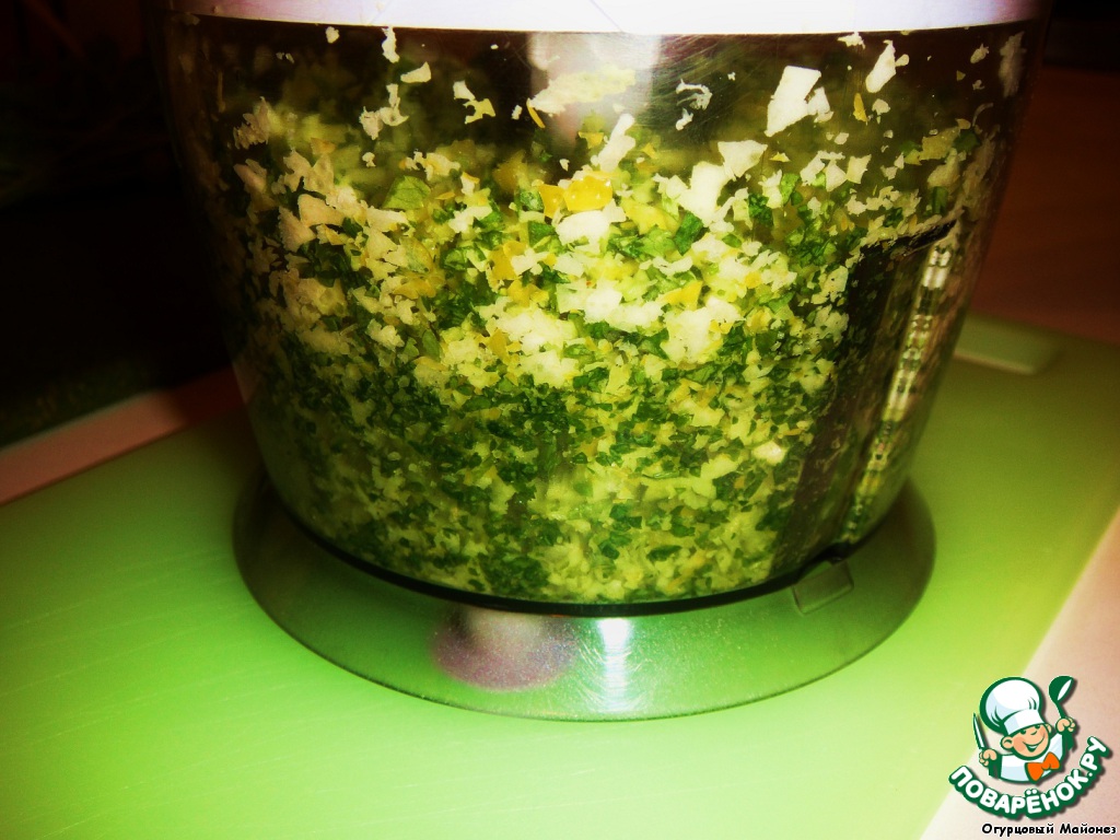 Измельчаем цедру лимона в блендере вместе с кинзой и очищенными зубчиками чеснока.