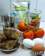 Куриное мясо, яйца, грибы и помидоры нарезать на мелкие кубики, заправить все майонезом.