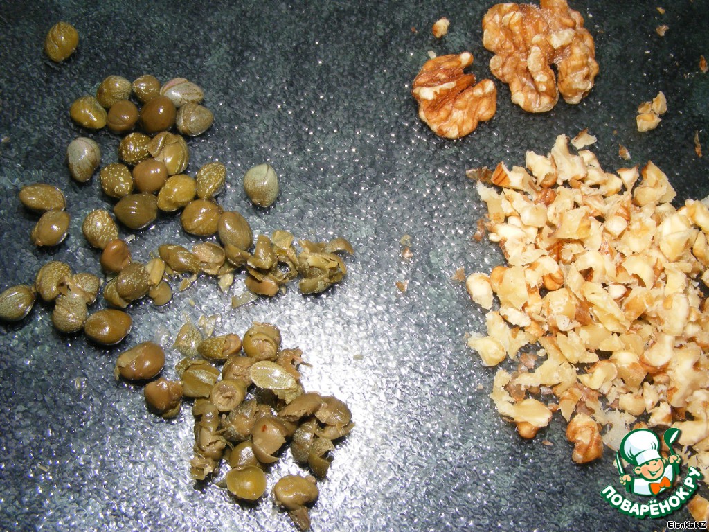Займемся соусов. Орехи рубим, каперсы режем, как можно мельче,