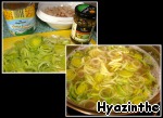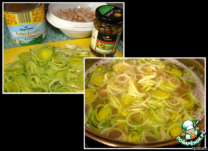 Автор рецепта предлагает взять зеленую часть лука порея, ошпарить кипятком, затем нарезать колечками.