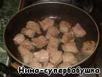 Мясо нарезать кубиками и обжарить в растительном масле до легкой румяной корочки. Положить мясо в кипящий бульон и поставить вариться на маленьком огне до мягкости.