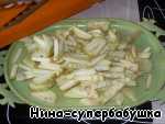 Баклажаны почистить и нарезать брусочками. Если баклажаны горчат, посолить их и оставить на 20-30 минут. Потом промыть.