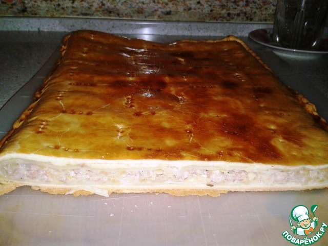 Распределить начинку в виде прямоугольного толстого пласта, слегка примять ее, чтобы держала форму. Края пласта теста смазать взбитым яйцом.