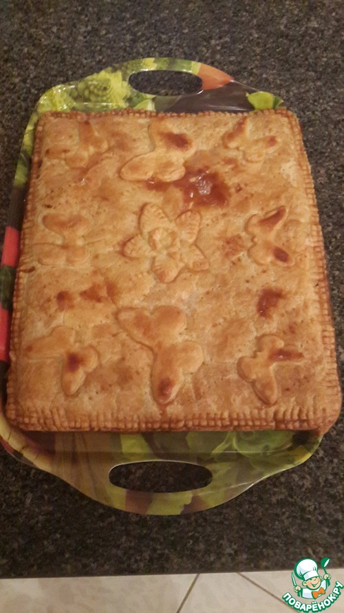 Распределить начинку в виде прямоугольного толстого пласта, слегка примять ее, чтобы держала форму. Края пласта теста смазать взбитым яйцом.