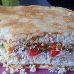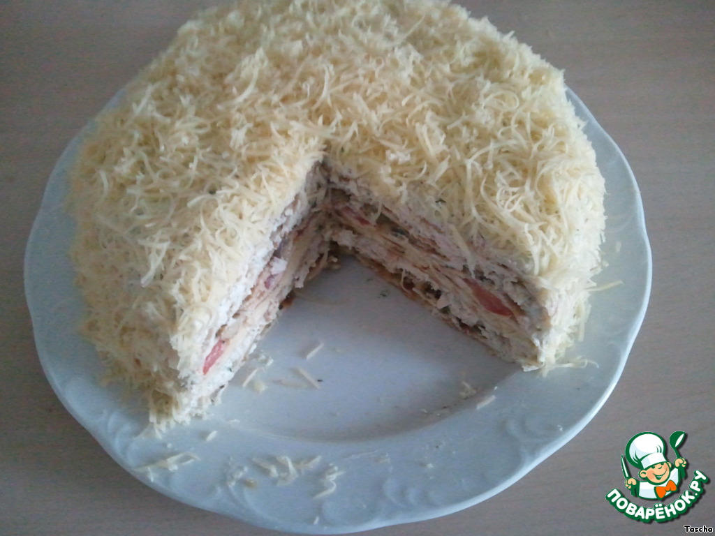 И повторяем все слои еще раз. Только последний (верхний) помидорный слой я поменяла на куриный.