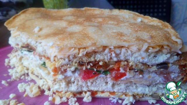 Накрываем блином, смазываем его творогом и кладем куриное мясо, разделив его на небольшие кусочки.