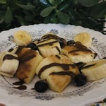 На блинчики кладем начинку, заворачиваем в рулетики и нарезаем кусочками. Красиво все укладываем на тарелку. Посыпаем сахарной пудрой, поливаем шоколадным сиропом и украшаем веточками мяты и клубникой.