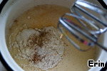 Добавляем молоко, муку, сахар, соль, пряности и растопленное сливочное масло.