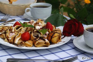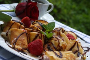 ... Однажды во Франции, а точнее в Париже, два влюбленных повара (он - шеф, она - су-шеф) решили в свой выходной приготовить роматический ужин. Ничего сытного есть не хотелось, и они решили испечь блинчики... Оказалось, продуктов не очень много (немало времени и сил они тратили на работе, питались там же, дома совсем не готовили). Открыв холодильник, они нашли яйца, молоко, сливочное масло и, как чудо, остатки маскарпоне и горсть ягод клубники... Как любые повара, они искусно придумали блюдо... ... Красиво украсив свой десерт, они накрыли на балконе стол, налили кофе... и, блаженно закрыв глаза, попробовали кусочек...