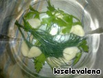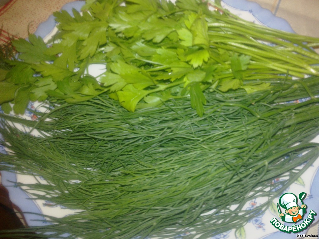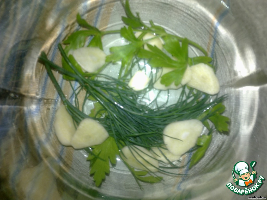 В каждую банку на дно кладем по несколько веточек петрушки и укропа, нарезанный зубчик чеснока и 3 шт. черного перца горошком. -