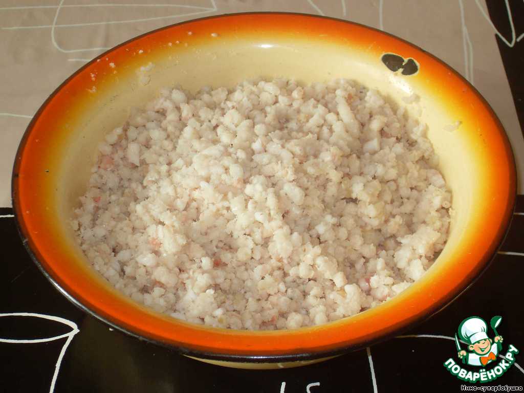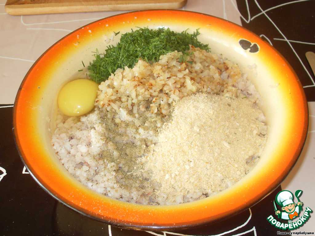 Смешать фарш, специи, яйцо, лук и сухари. Хорошо вымесить массу.
