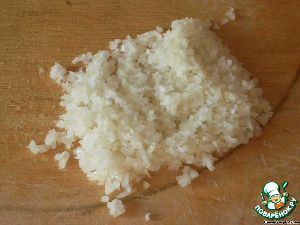 Лук нарезать очень мелко и обжарить в растительном масле до золотистого цвета.