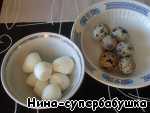 Перепелиные яйца сварить не более 5 минут, охладить и очистить.