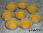 Разделить тесто на 15-20 шариков. Раскатать их в блинчик и выложить в формы для кексов.