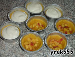 На выложенное в формочки тесто насыпаем нарезанный кубиками персик (можно другие фрукты: груши, яблоки, твердые сливы) и сверху покрываем кремом. Примерно 1 столовая ложка крема на 1 кекс.
