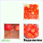 Первым делом подготавливаем помидоры. Нам надо их "раздеть". Для этого надо их помыть, кожицу в одном месте надрезать крест-накрест, опустить в кипяток примерно на 30 секунд. После достать шумовкой и сразу же опустить в холодную воду. После этого доставать по одному и снимать кожицу. Она после такой шоковой терапии слазит сама. -