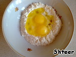 Муку просеять в миску. В муку вбить 2 яйца. Все хорошенько перемешать.