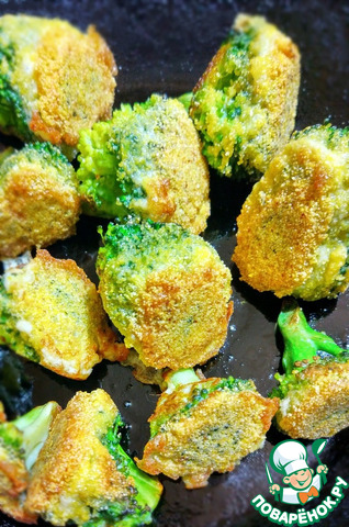 Разогреть в сковороде постное масло. Обмакивать готовые соцветия брокколи вначале в омлетную массу, потом хорошенько обваляйте в панировочной смеси и выкладывать в сковороду. Обжаривать с двух сторон на среднем огне в течение 3 - 5 минут.