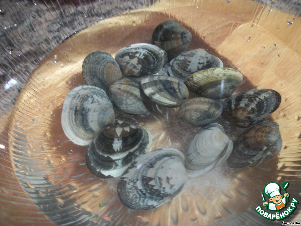 • Тем временем подготовим морепродукты. Альмехи положим в холодную соленую воду, чтобы вышел весь песок.