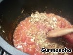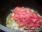 • Помидоры ошпарим, очистим и нарежем кубиками. Добавим в лук.