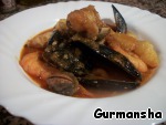 • Даем покипеть немного, чтобы вкусы смешались и успела свариться картошка. Солим, перчим по вкусу. Хоть рыбные ингредиенты и подаются отдельно, в некоторых ресторанах их подают вместе. Так поступила и я. Потихоньку кладем кальмары, креветки и моллюски в готовый соус.