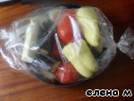 Кладём подготовленные баклажаны, кабачок, чеснок, помидоры и перцы в рукав для запекания. -