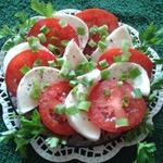 На салатике начинаем раскладывать по кругу, чередуя: помидорка/сыр.