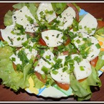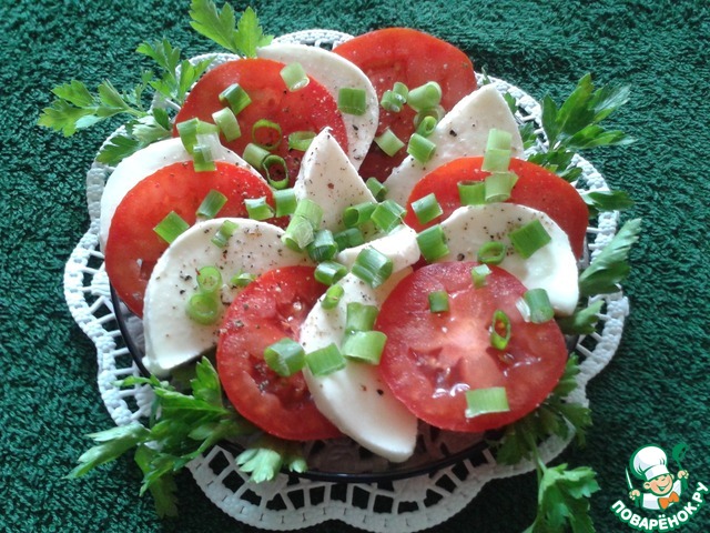 Мелко нарубленым зеленым лучком посыпаем сверху и обильно поливаем оливковым маслом (если масла добавить мало, то оно быстро стечет вниз, под салат, и помидорки останутся сухими).