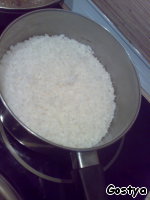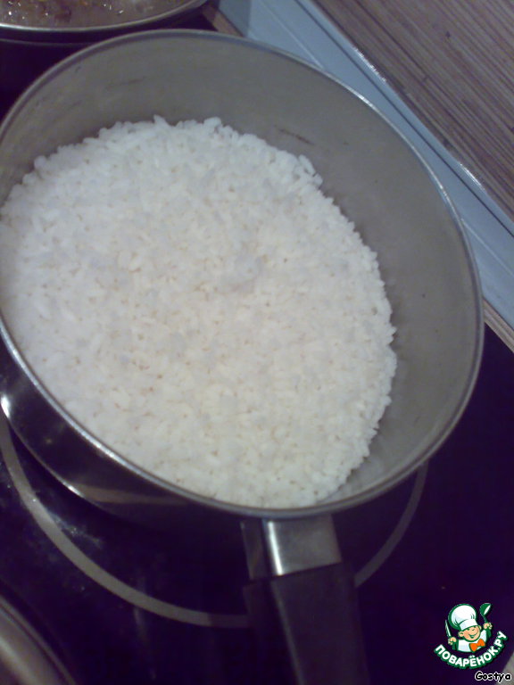Отварить рис с добавлением соли (1/2 ч. л) и сахара (1/2 ч. л).