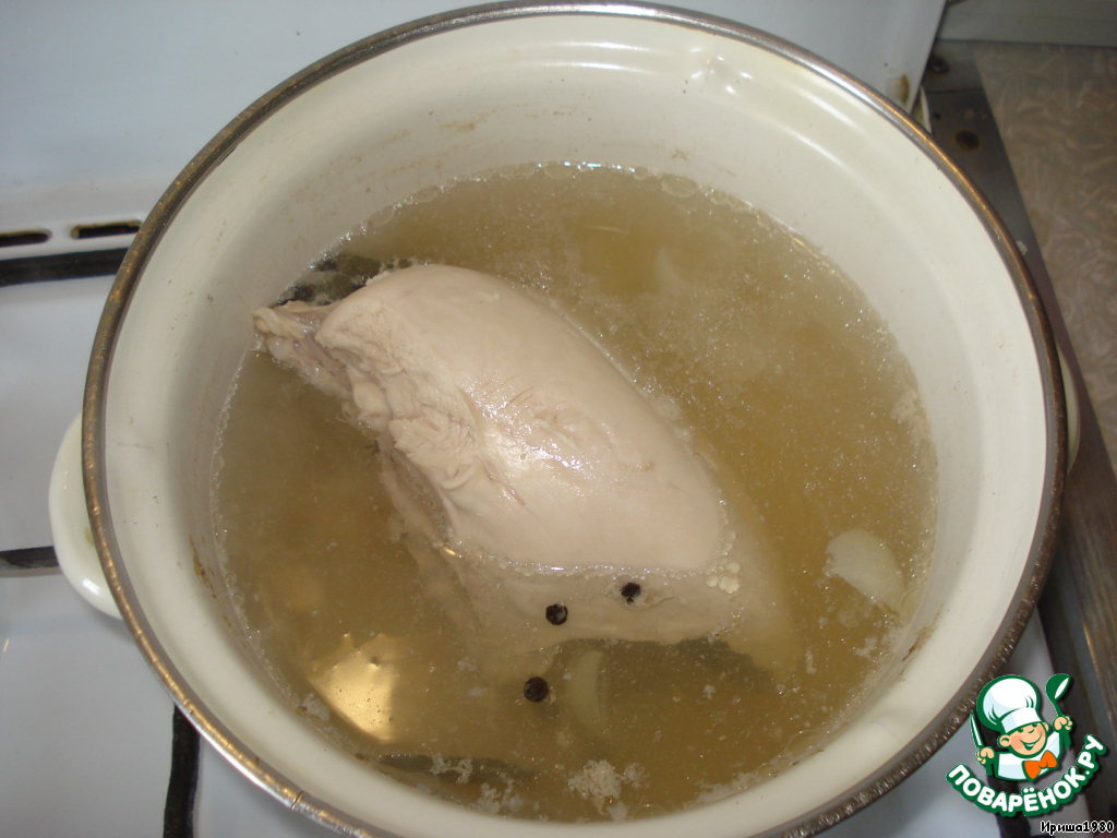 Отвариваем куриную грудку в подсоленной воде с добавлением перца горошком, лаврушки и одной луковицы.