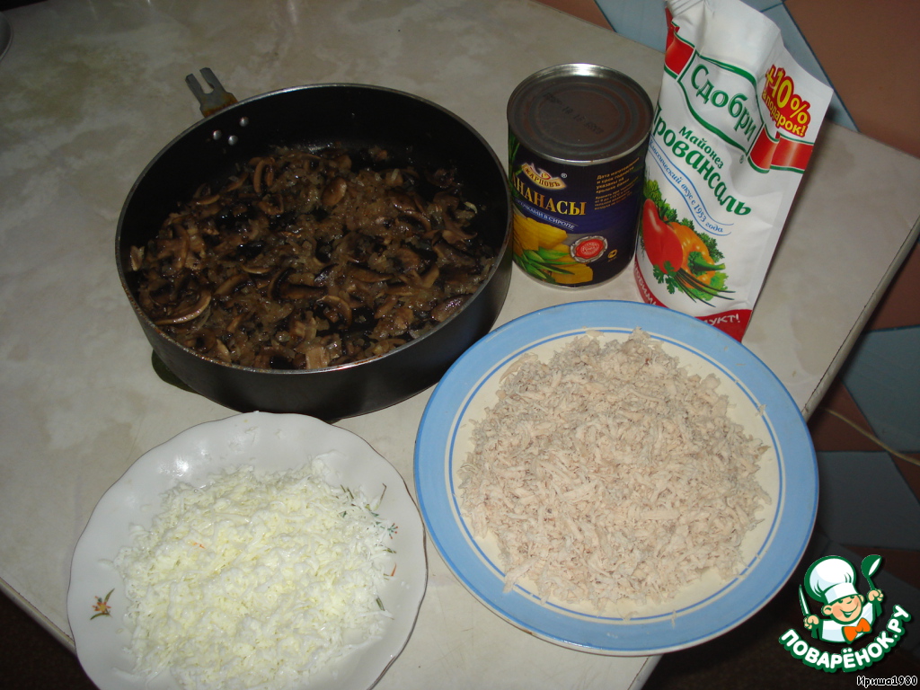 1 слой - шампиньоны и лук обжаренные.(этот слой и так жирный куда здесь майонез?)