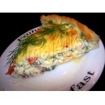 Раскатаем тесто в пласт, заполним им форму с бортиками (я взяла форму 26 см в диаметре), сделаем легкие проколы вилкой, затем выливаем заливку и ставим в разогретую до 180 град. духовку на 30-35 минут.