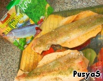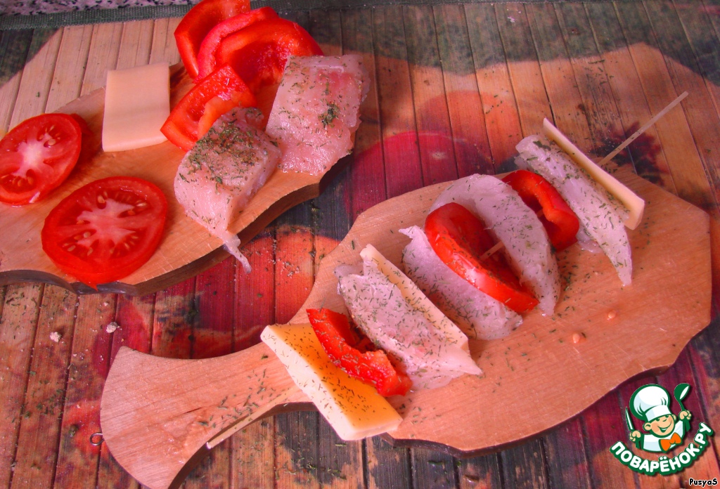 Кусочки рыбы чередуем с ломтиками сладкого перца, сыра и помидора. Нанизываем это все чудо на металлическую шпажку. Поливаем растительным маслом и запекаем в духовке 25 минут при температуре 180 град.