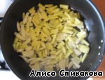 Начинаем с картофеля, режем его тонкой соломкой и отправляем в сотейник, где обжариваем почти до полной готовности. Добавляем соль по вкусу. Картофель должен покрыть дно ровным слоем. Готовим на среднем огне. -