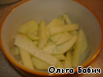 Далее чистим и режим приблизительно такими же полосками яблоко и поливаем его соком лимона.