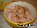 Теперь нарежем полосками грудку, замаринуем с перцем, солью, добавим немного сока лимона.