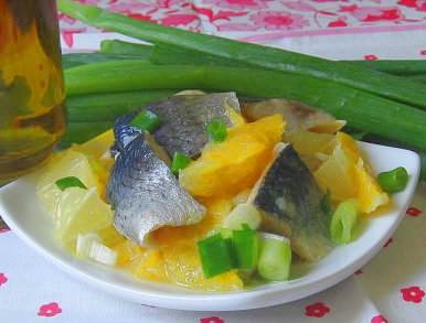 3. Филе сельди нарежьте на кусочки шириной 4 см, выложите на блюдо вместе с апельсином, лимоном и зеленым луком.