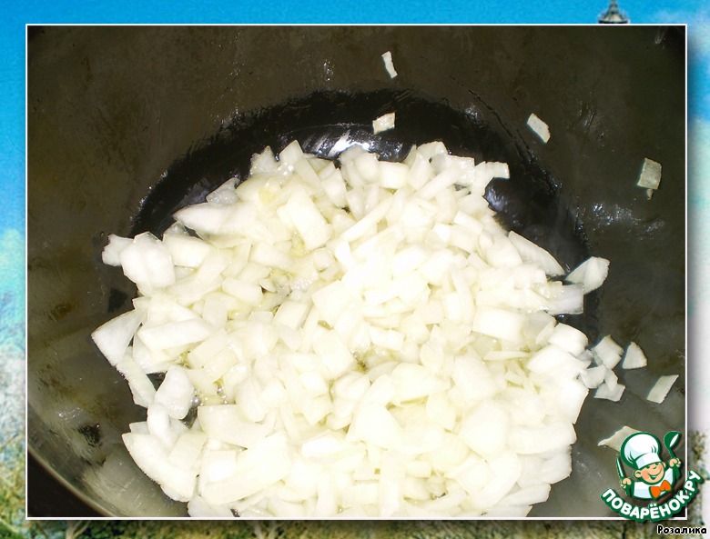 Лук чистим, моем, мелко шинкуем. Кладем для обжарки 5-7 минут на небольшом огне до прозрачного цвета.