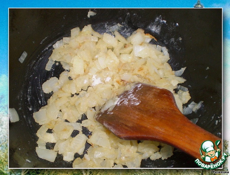 Два зубчика чеснока почистить, сполоснуть и раздавить чесночной давилкой, добавить в лук. Две столовые ложки муки высыпаем, жарим три минуты на небольшом огне, постоянно помешивая, чтобы не пригорело, и мука не стала коричневой.