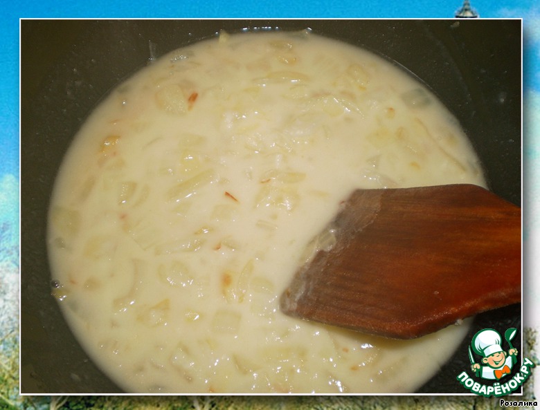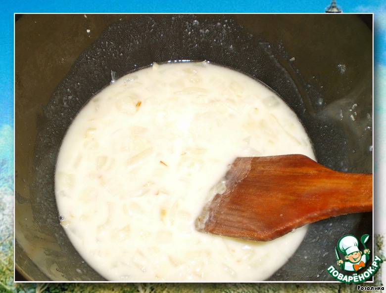Снимаем с огня кастрюлю и вливаем стакан куриного или говяжьего горячего бульона. Хорошо размешиваем, чтобы получилась густая каша.